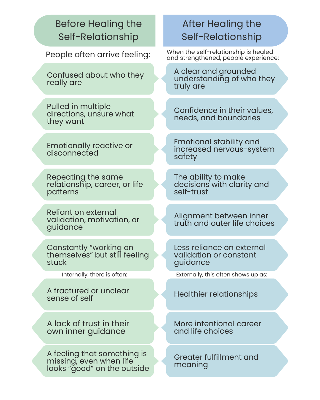 SELFHEAL™ focuses on restoring the relationship with the Self — because without a grounded sense of who you are, change is often temporary, confusing, or unsustainable.